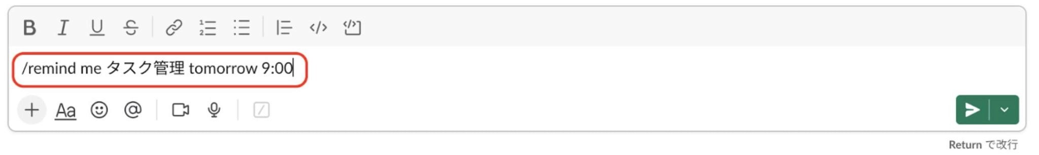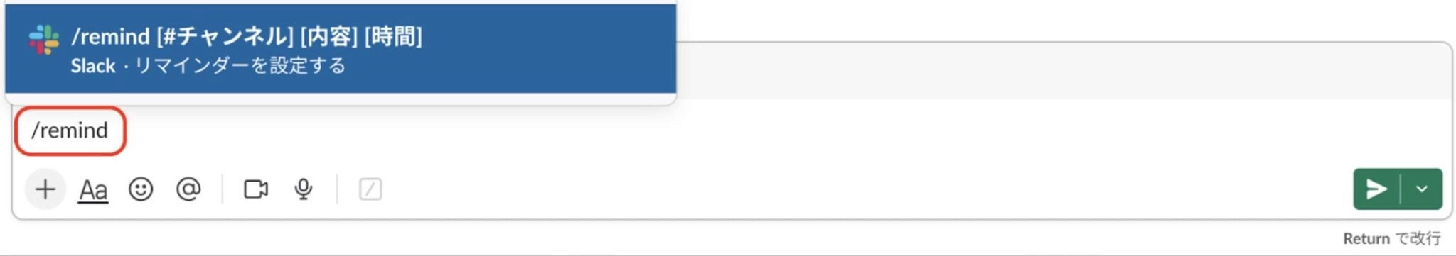 ①メッセージ入力欄に「/remind」というコマンドを打ち込む
