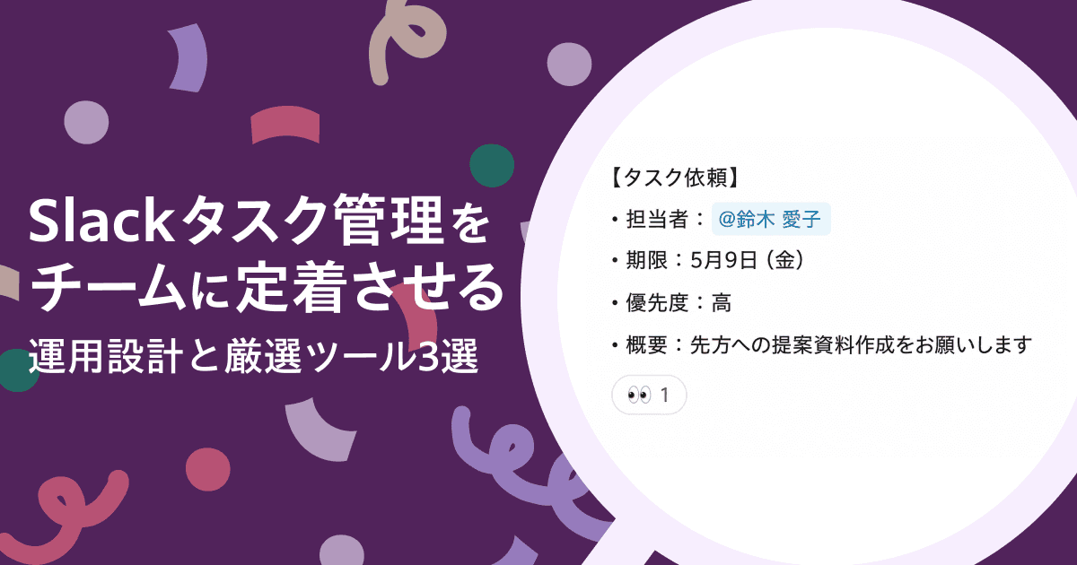 この記事では、Slackのタスク管理がうまくいかない原因・Slack標準機能の活用法・チームでのタスク管理の運用設計ステップ・おすすめ外部ツールについて解説します。
