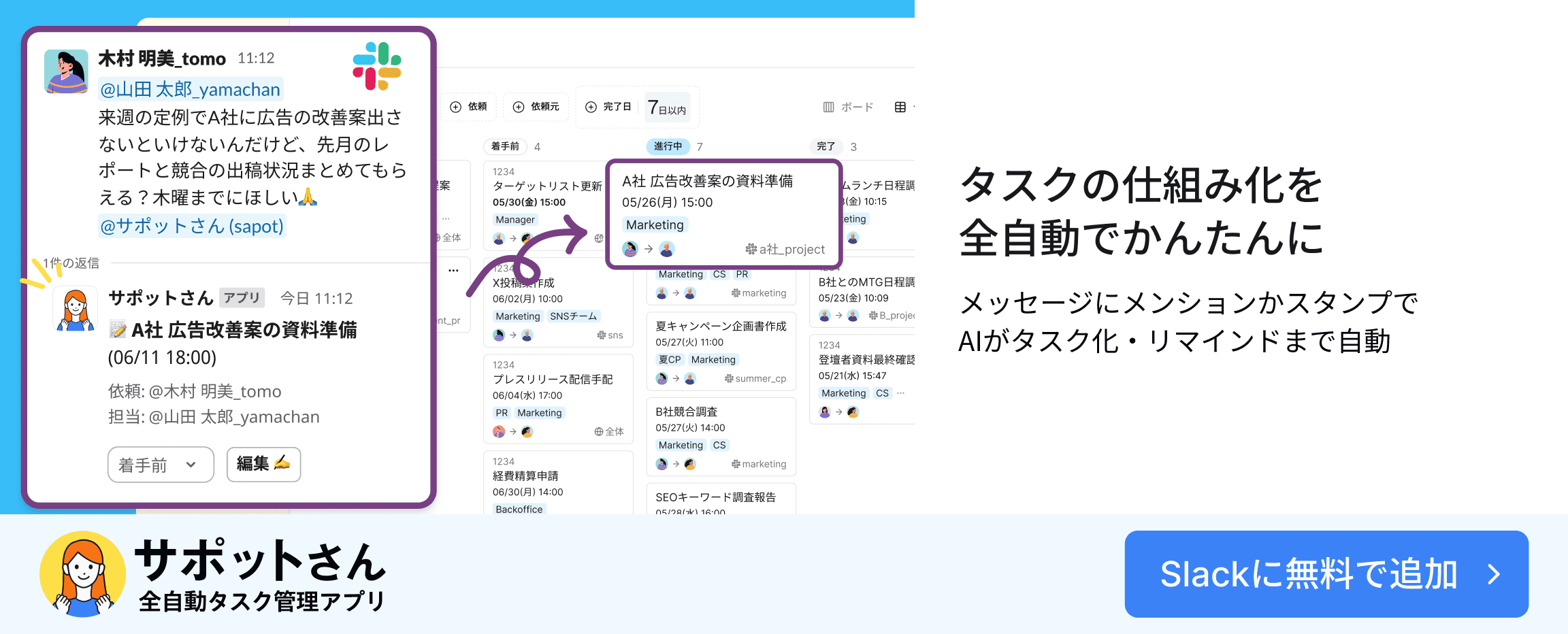 これまでのSlackの使い方を変えず、依頼の抜け漏れをなくしたい方におすすめなのが、全自動タスク管理ツール「サポットさん」です。Slackの依頼メッセージに、サポットさんをメンションするか絵文字でリアクションするだけで、メッセージ内容をAIが要約してタスクを作成してくれます。