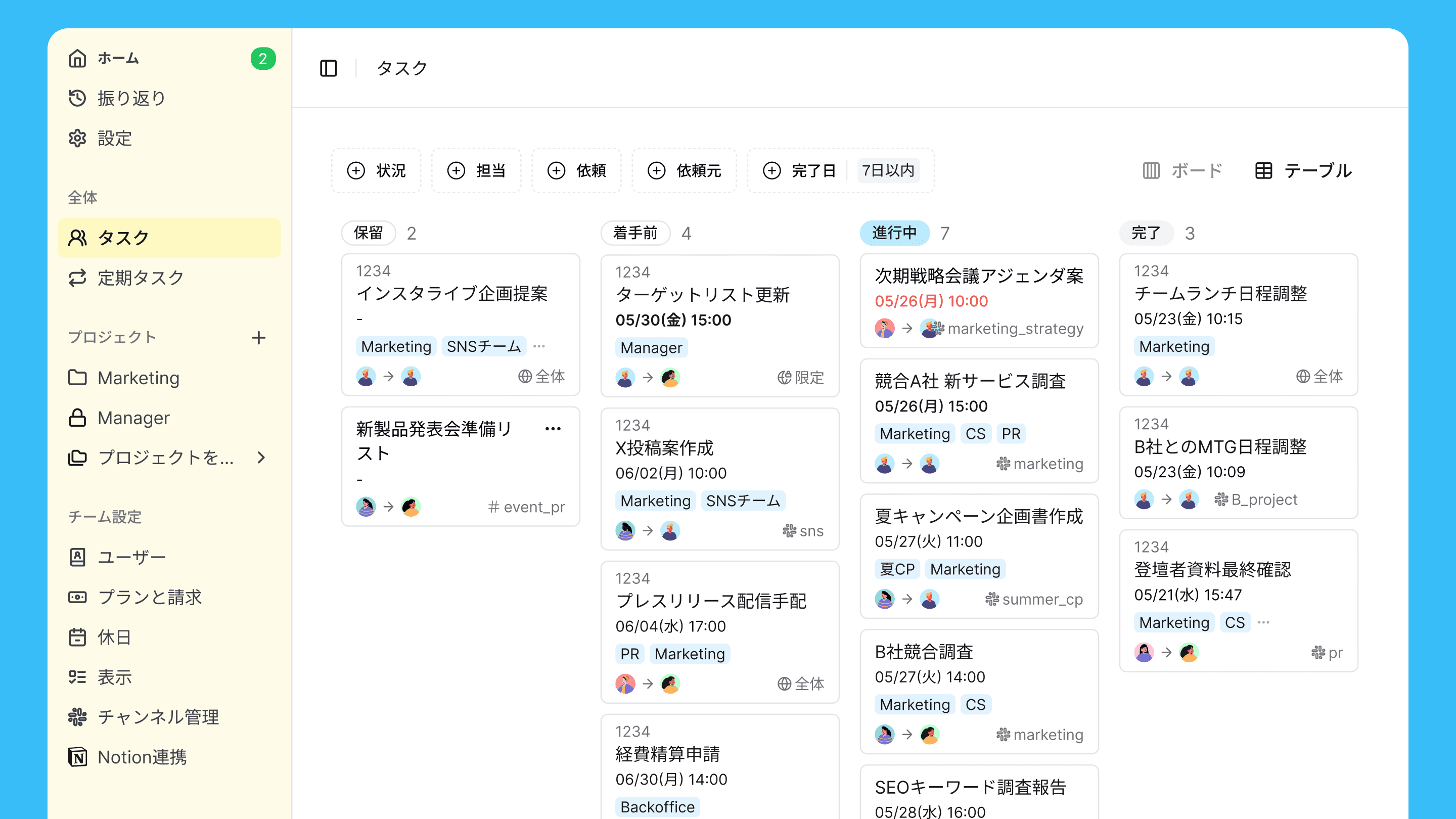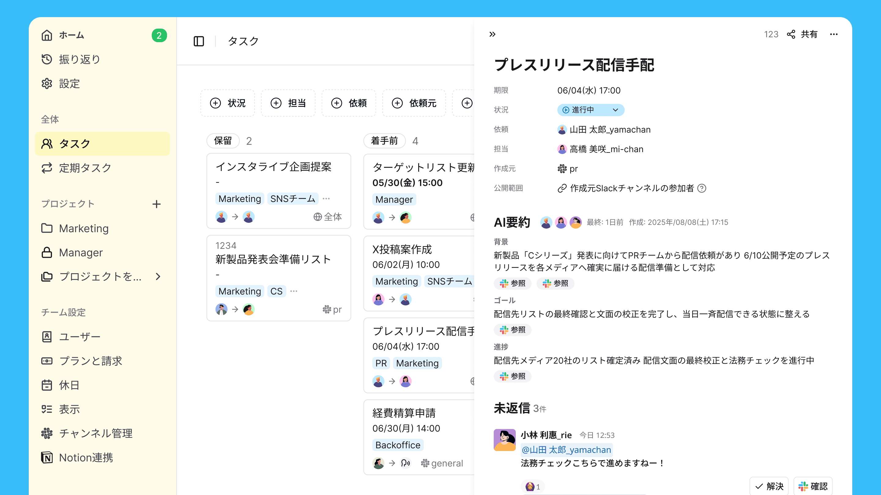 確実に進捗を把握したいなら、タスクの状態を自動で追跡・リマインドしてくれるタスク管理ツールとSlackを連携させる方法がおすすめです。