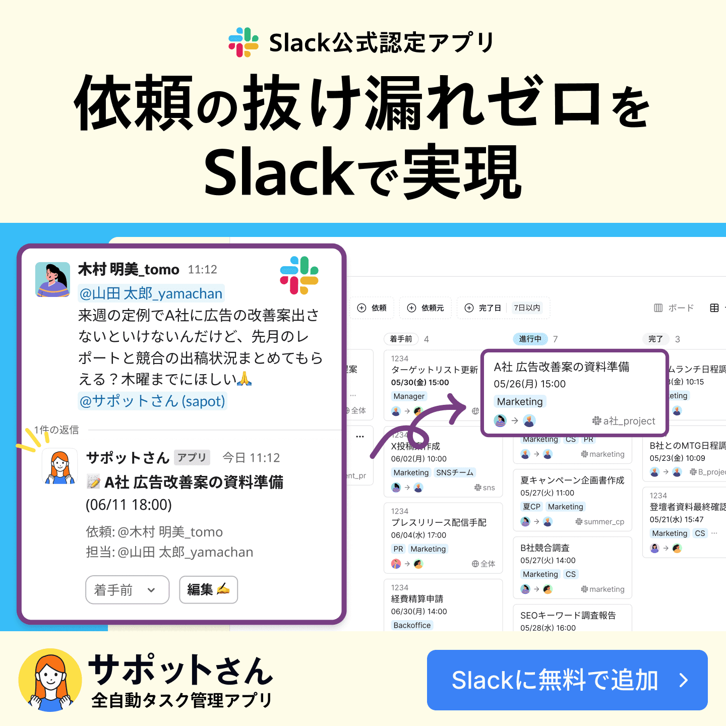 そんなチームには、スタンプひとつでタスク管理が完結するSlackアプリ「サポットさん」がおすすめです。
