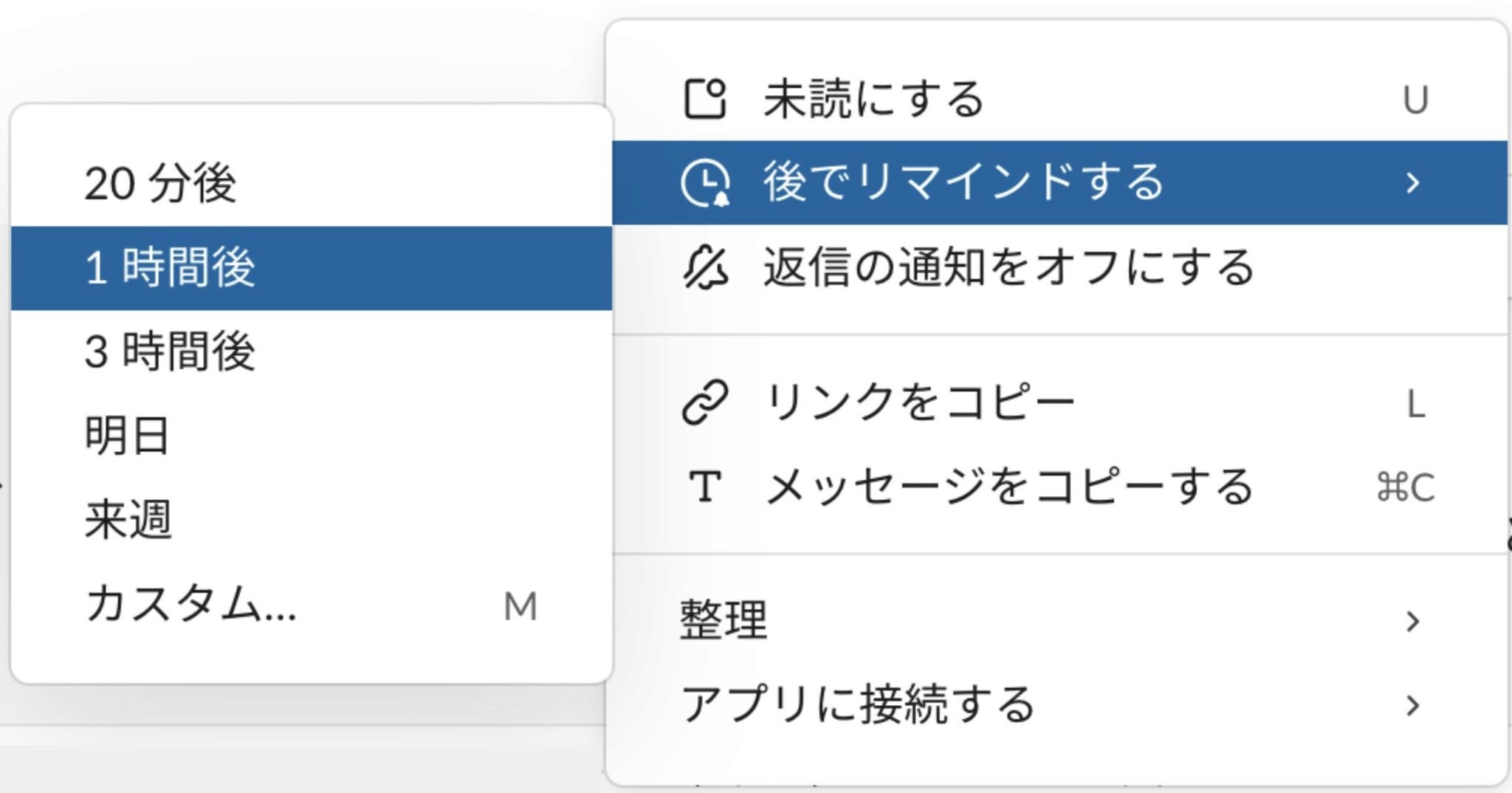 メッセージの右上にある3点アイコンから「後でリマインドする」を選んで時間を設定すれば、そのメッセージに対して直接リマインダーを設定できます。