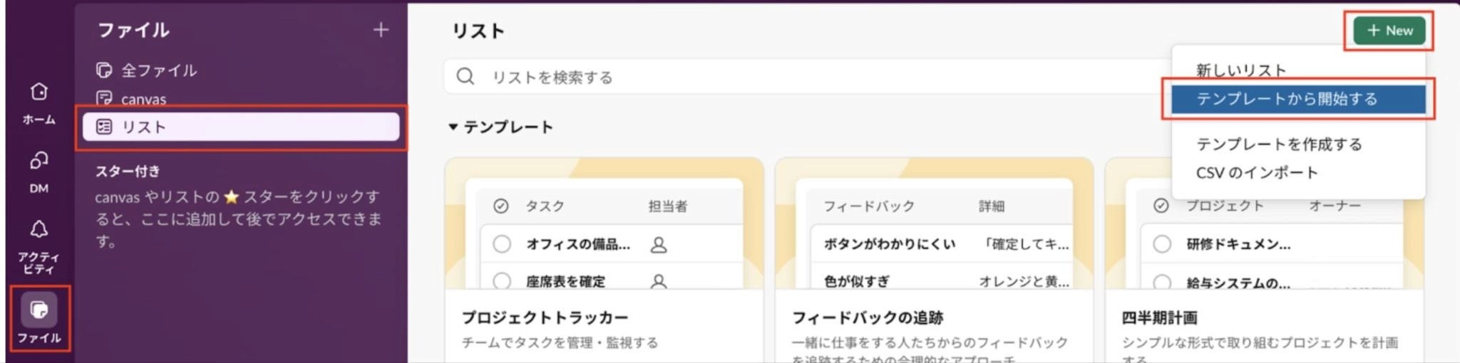 ①サイドメニューから「ファイル」→「リスト」を選び、「+New」をクリックすると出てくる「テンプレートから開始する」を選択します。