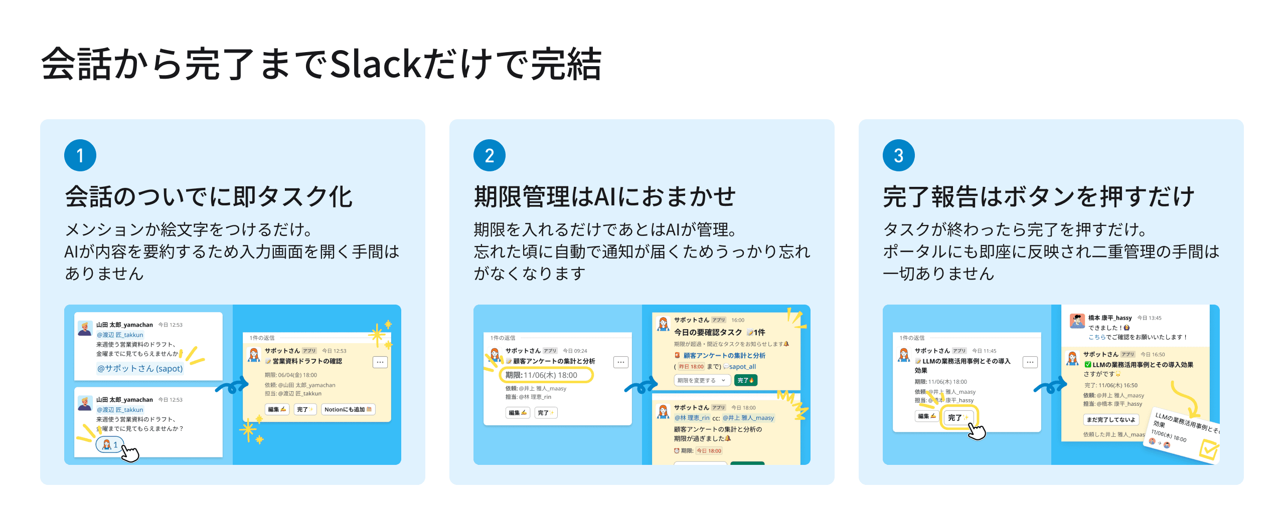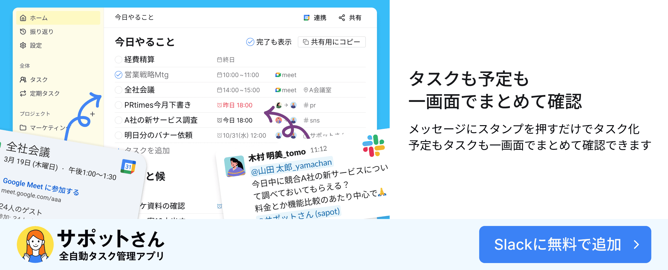 Slackでタスク管理も行いたいなら、全自動タスク管理アプリ「サポットさん」がオススメです。