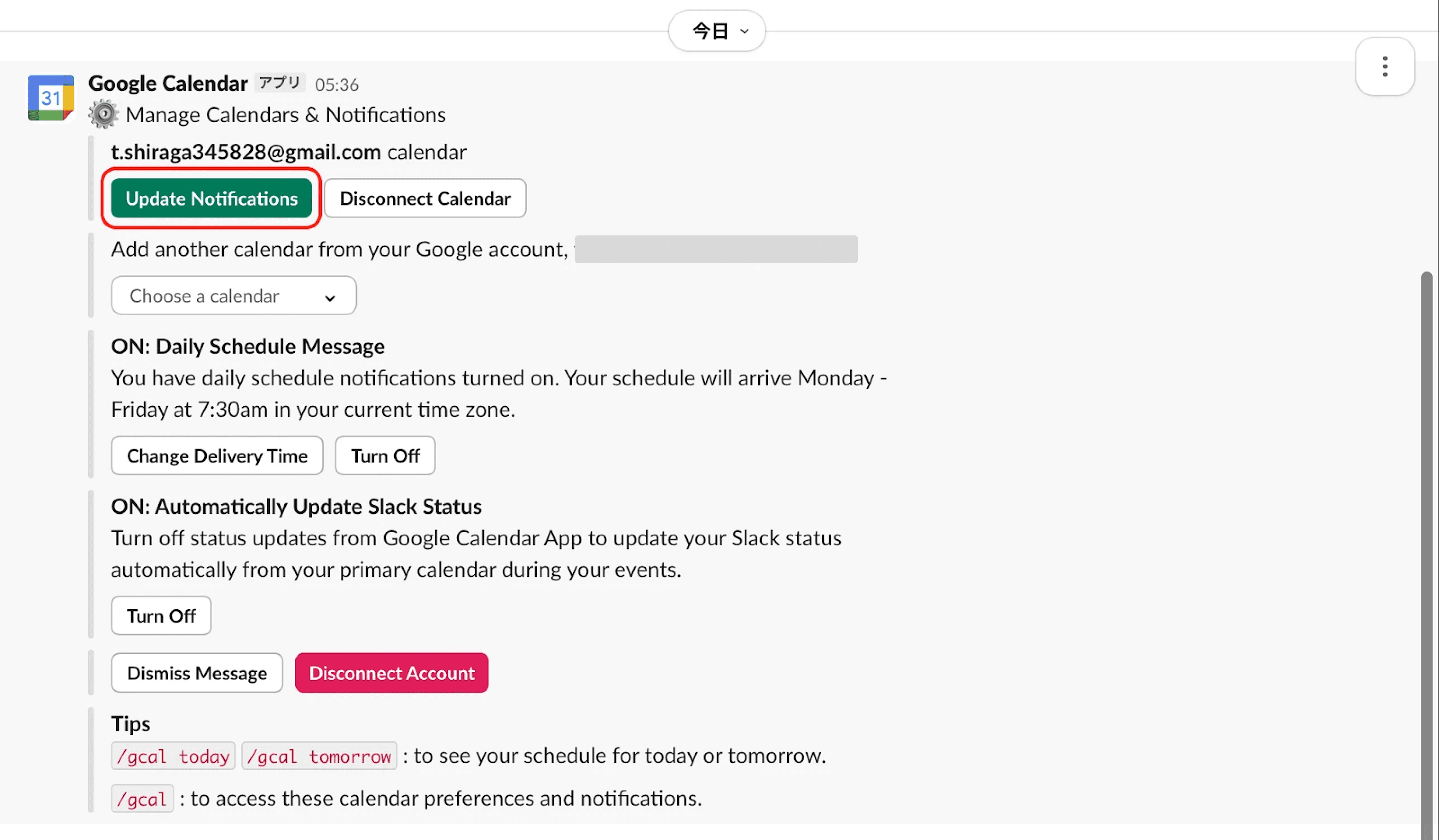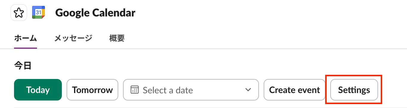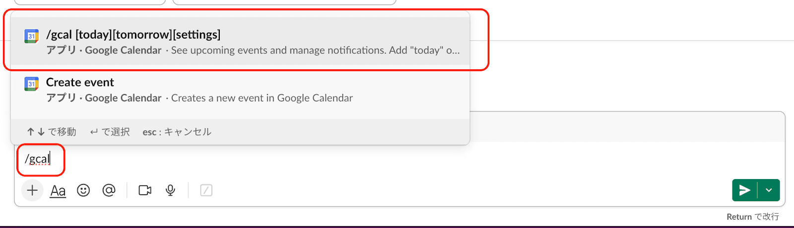 ③通知が来るようにしたいチャンネル内で、「/gcal」と入力してGoogleカレンダーを呼び出します。