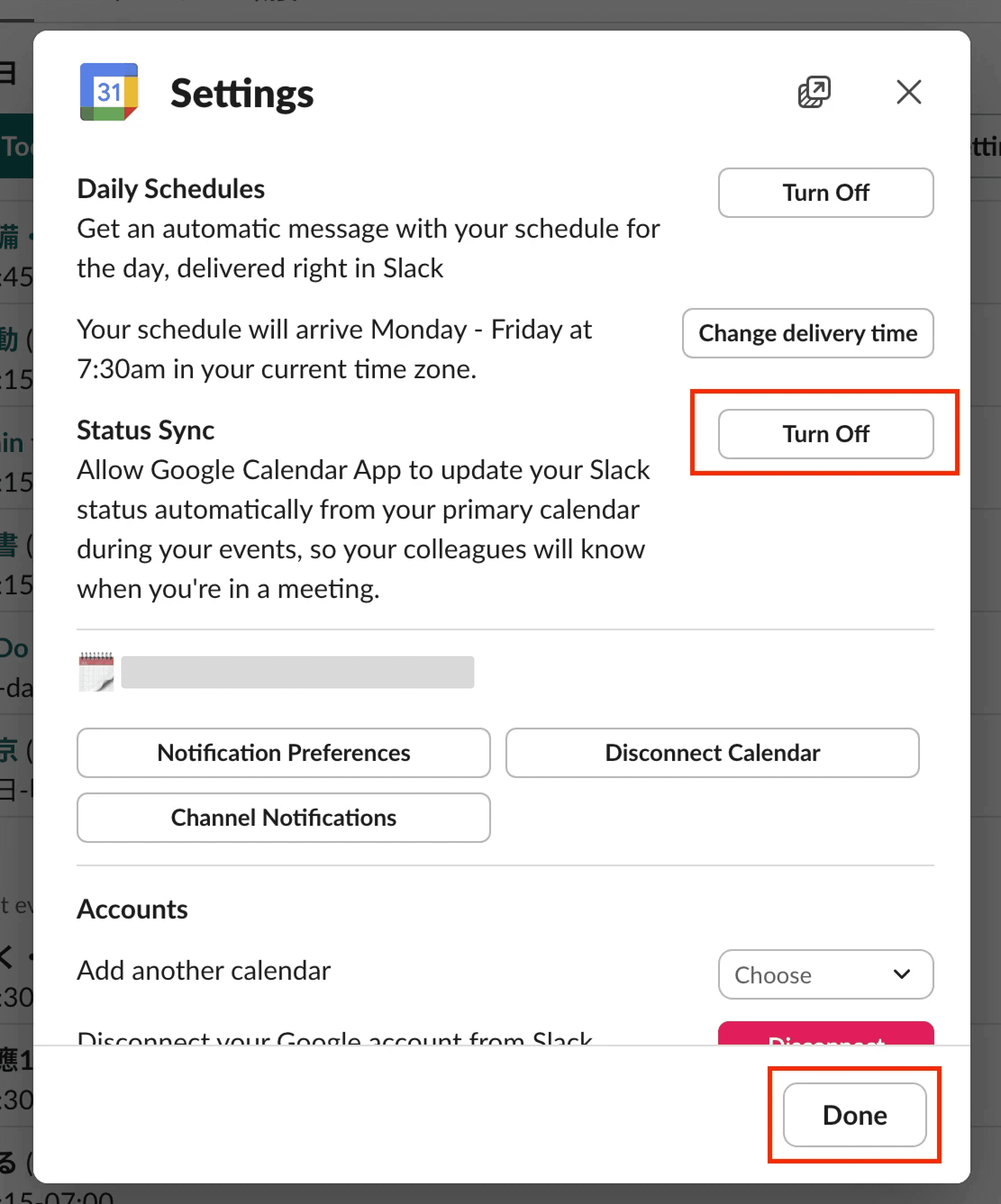 ③「Status Sync」の右側にあるボタンをクリックし、「Turn Off」と表示されれば、アイコンの上部にステータスのアイコンが表示されます。完了したら「Done」をクリックし、終了しましょう。