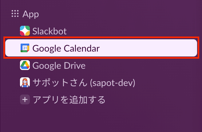 ①Slackのサイドバーから「App」内にある「Google Calendar」を選択します。