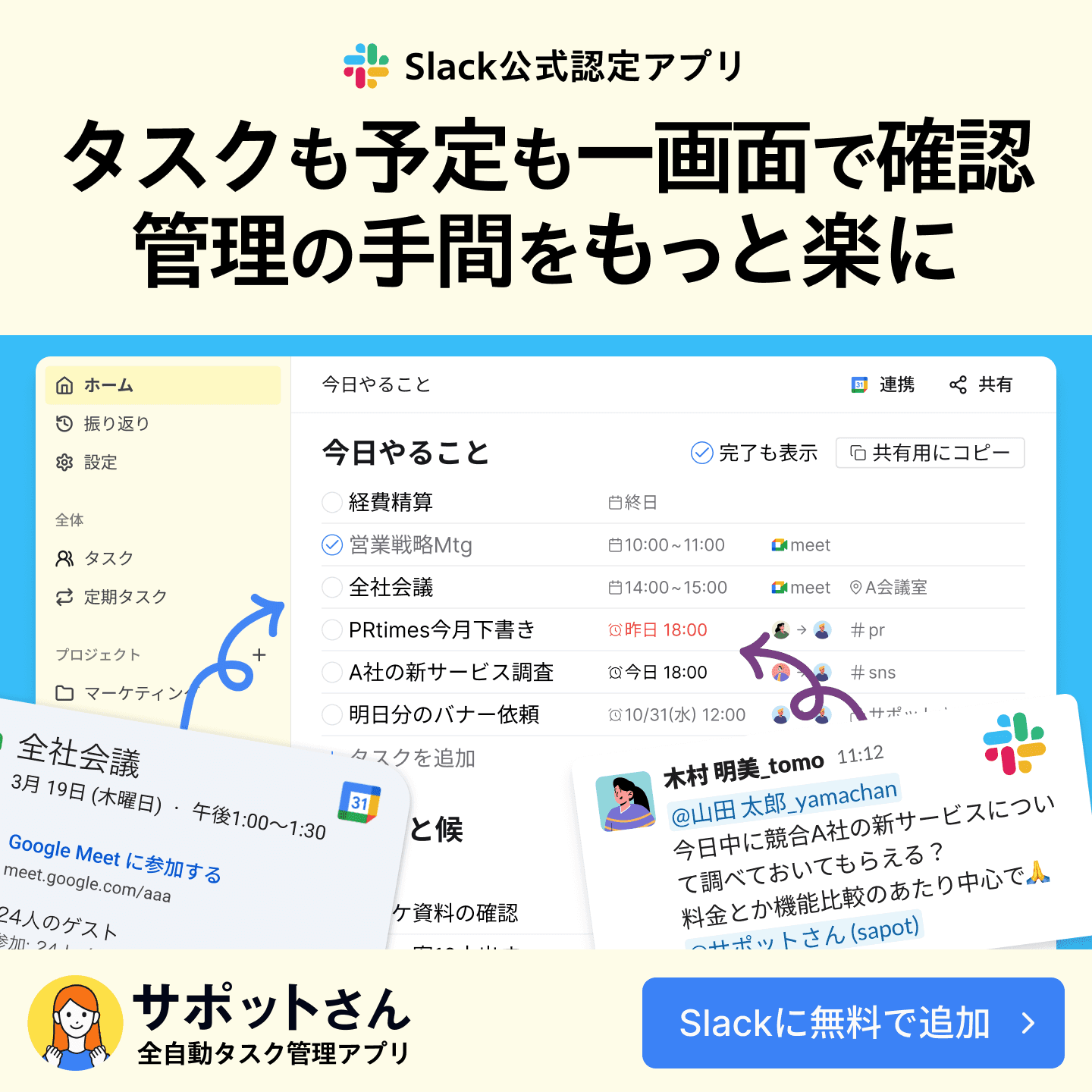 Slack上での面倒な日程調整・タスク登録を、まるごと自動化してくれます。