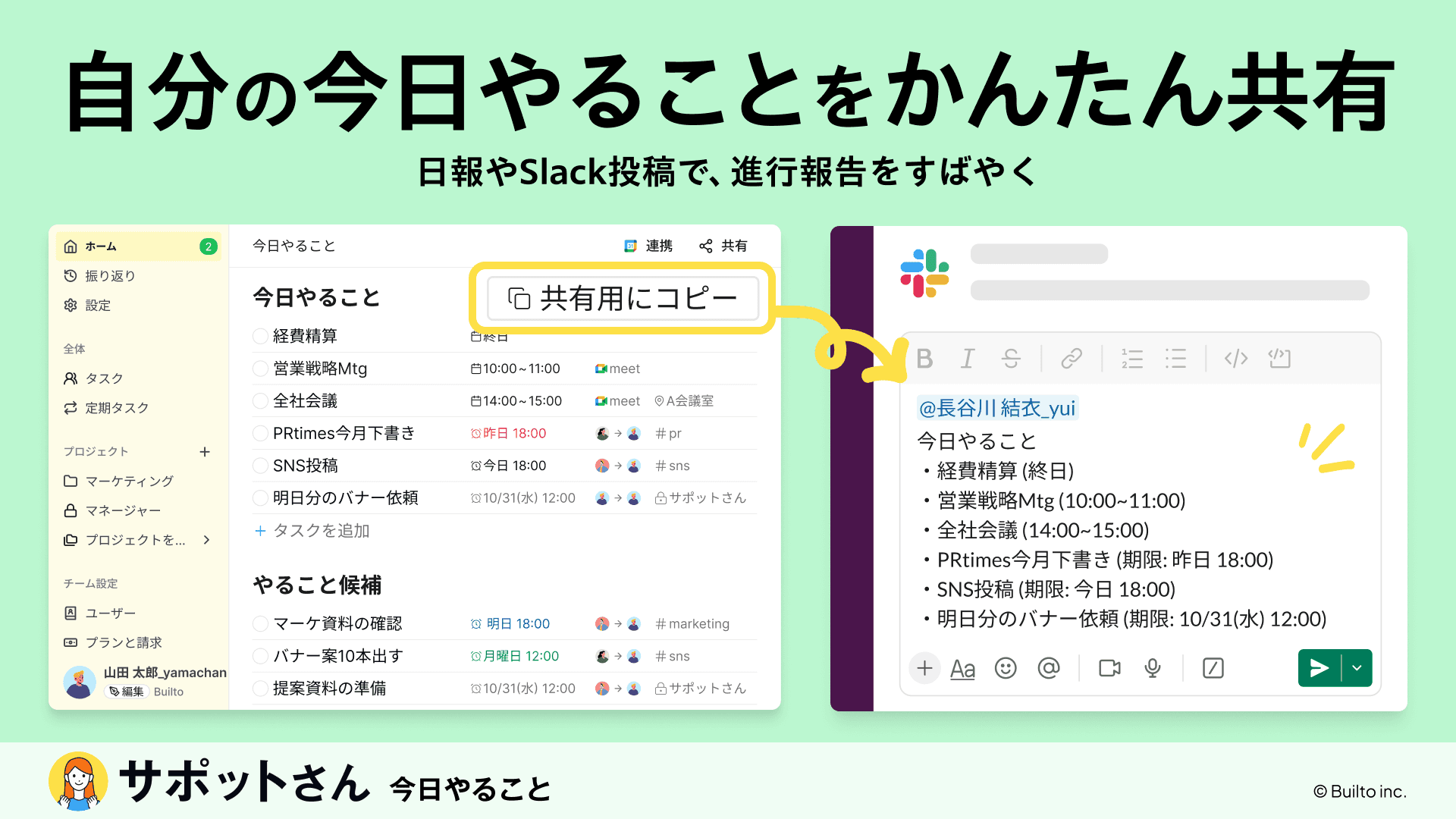 日報やSlack共有として貼り付けられるので、チームで簡単にスケジュール共有できます。
