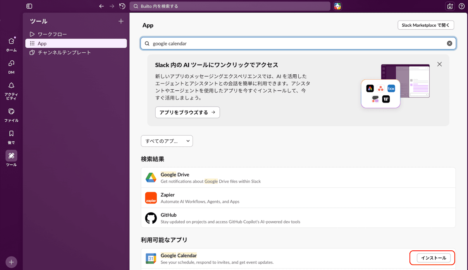①左側のメニューから「ツール」→「App」を選択し、「google calendar」を検索してアプリをインストールします。