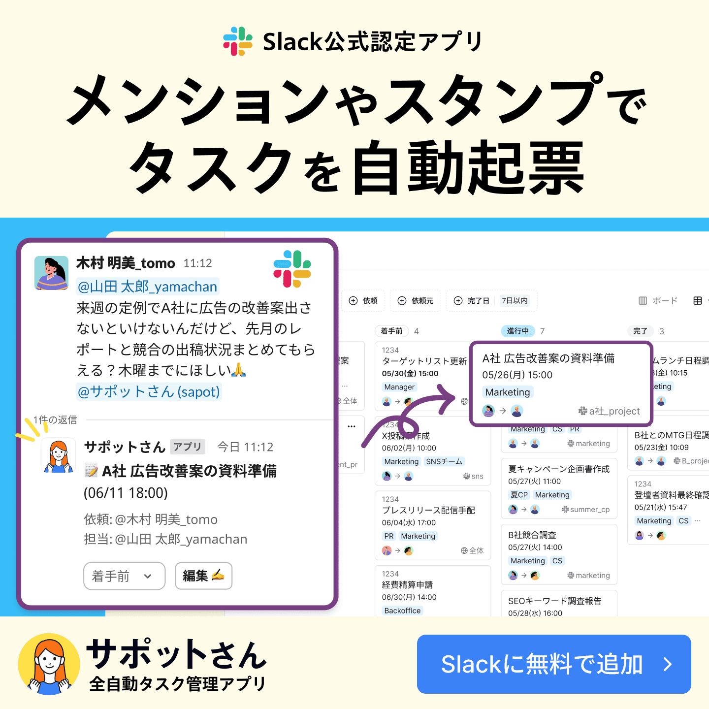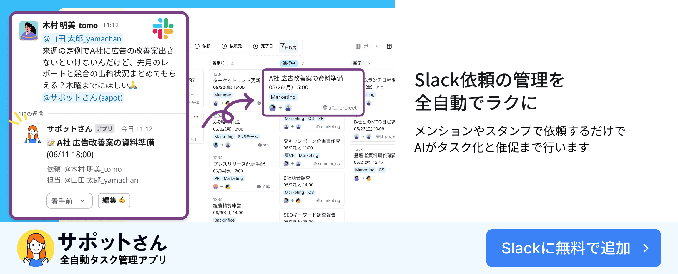 全自動タスク管理アプリ「サポットさん」は、SlackのメッセージからAIがタスク・担当者・期限・背景までを自動で読み取るので、入力の手間を無くすことが可能です。