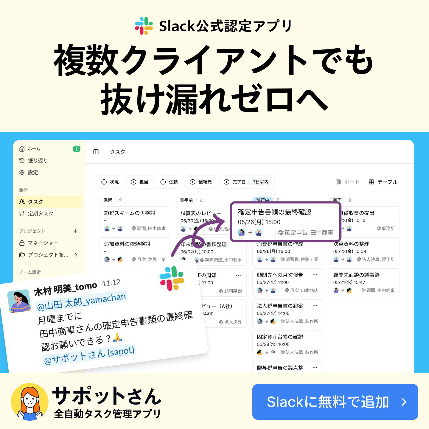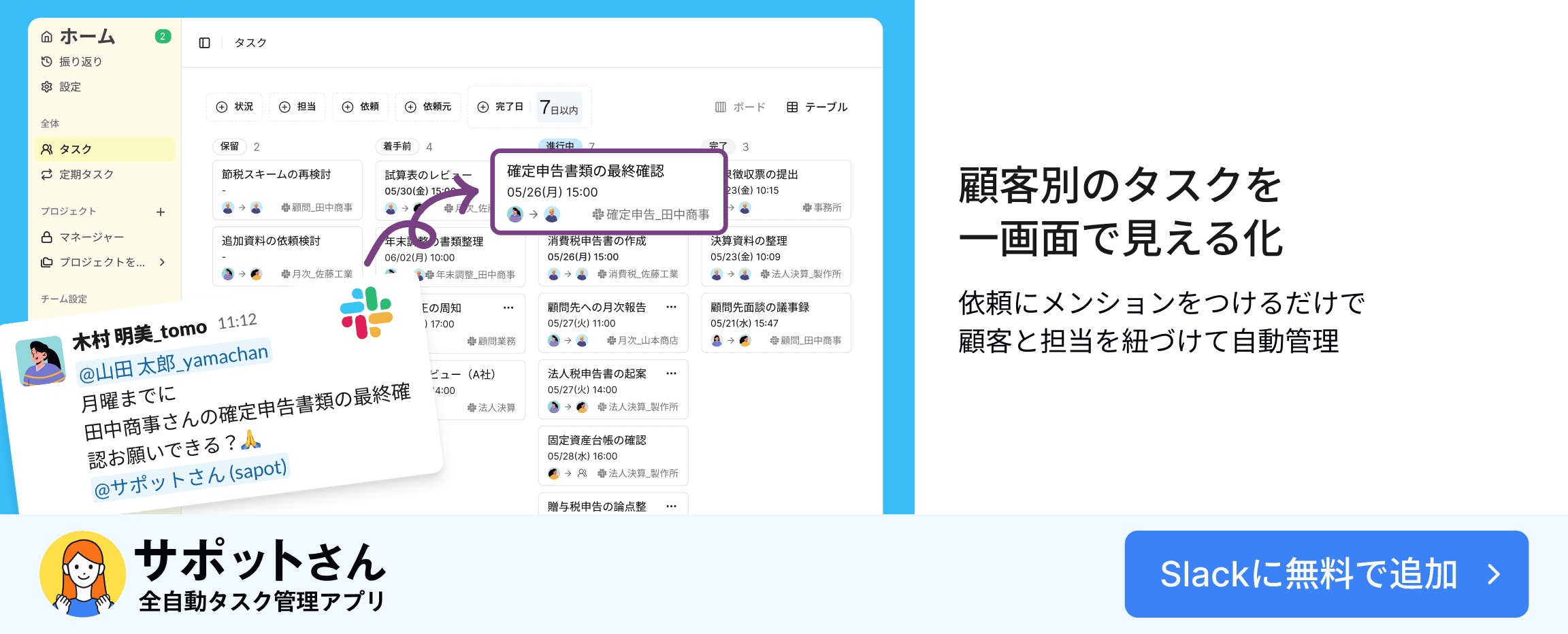 また、会計事務所のタスク管理に関する課題を解決できるツールとして、Slack連携のAIタスク管理アプリ「サポットさん」がおすすめです。