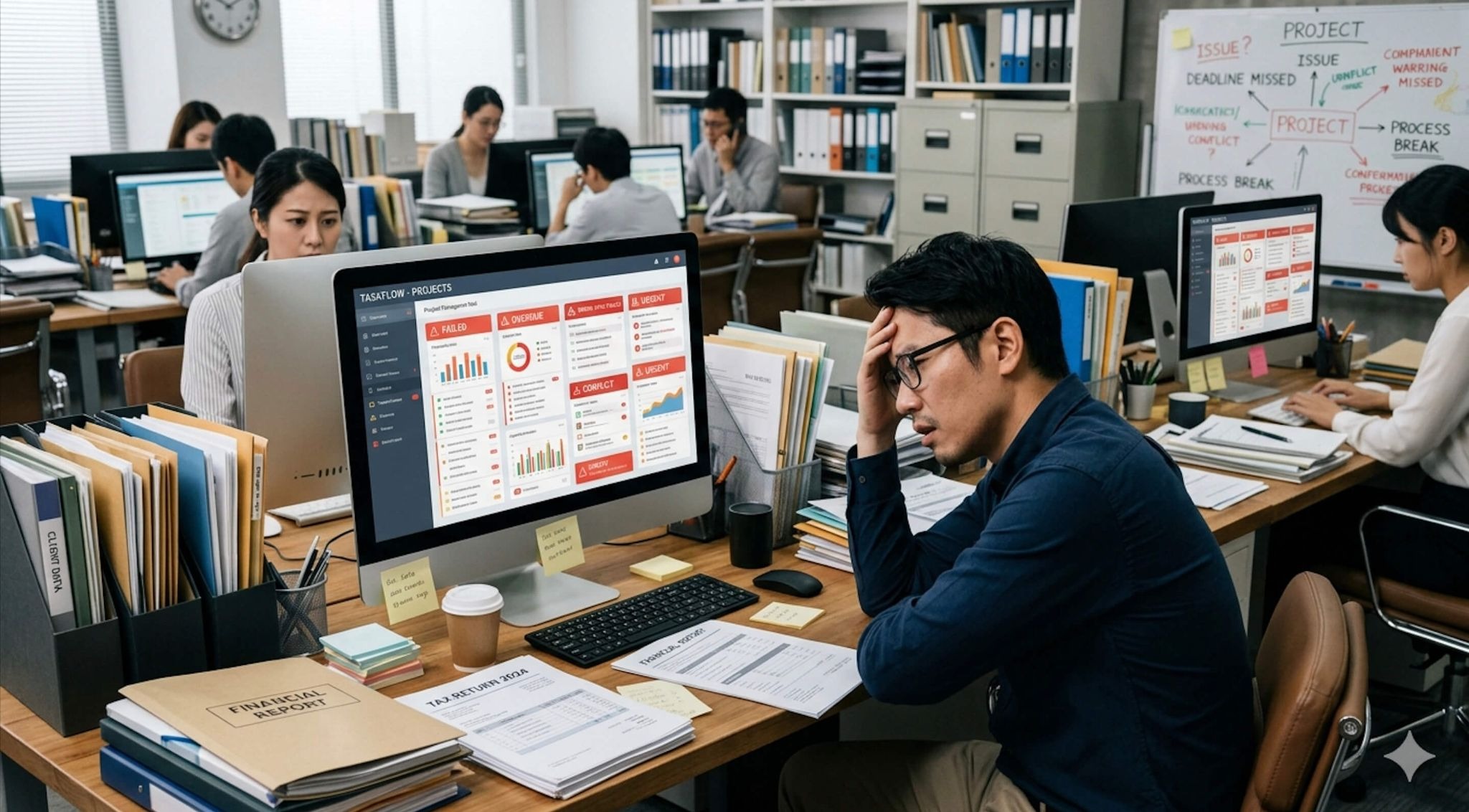 複数クライアントの業務を同時に実行する会計事務所では、タスク管理のちょっとしたミスが、申告期限の遅延・対応漏れという問題に直結します。
