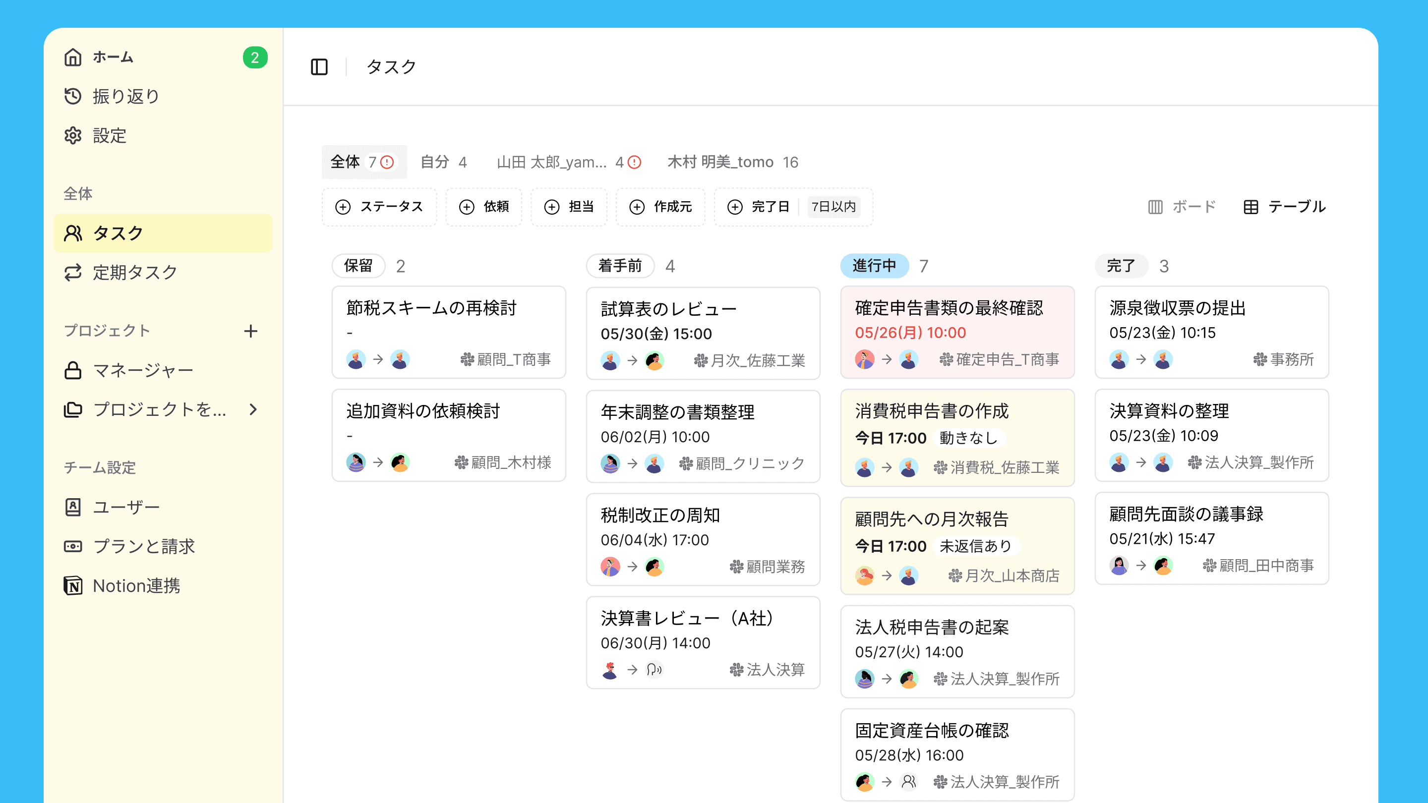 タスクは顧客名・業務種別・担当者でタグ付けし、優先順位をすぐ判断できる状態に保つ