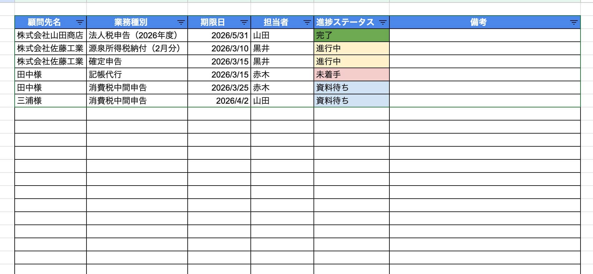 Excelで管理する場合、「顧問先名・業務種別・期限日・担当者名・進捗ステータス」の5列を設けると、誰が見ても状況を把握できる一覧表が作れます。