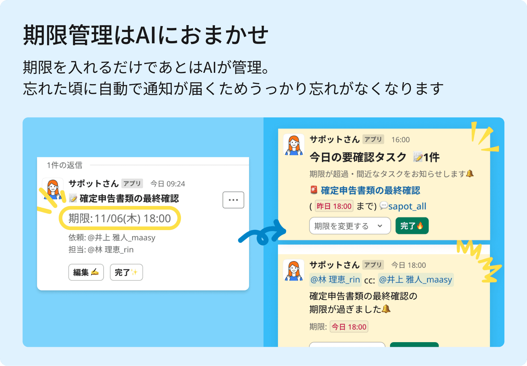 期日前にAIがリマインド→完了の確認を自動化