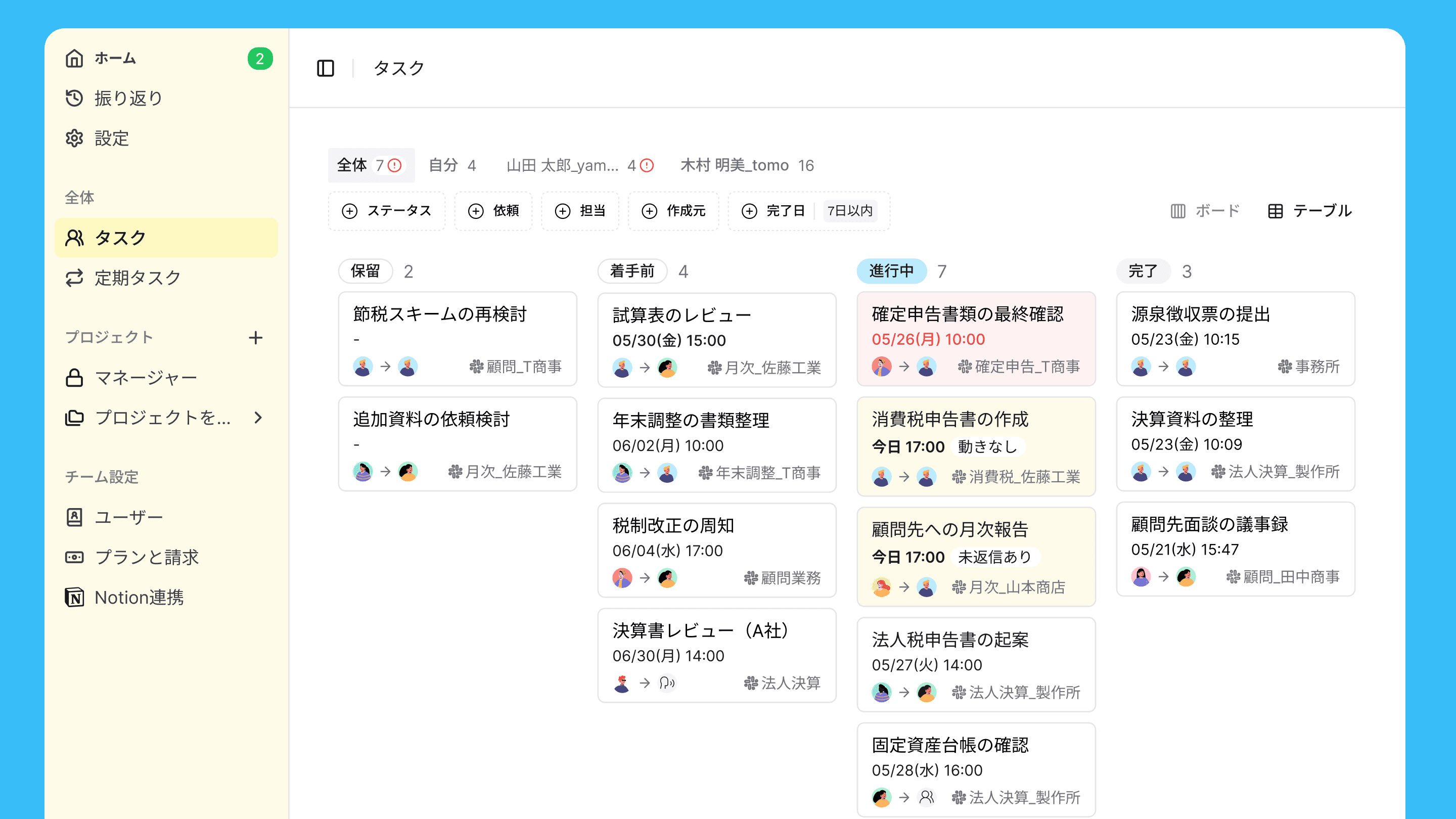 「決算書類確認」「税務署用書類作成」などタスクだけを書くのでなく、顧問先単位・案件単位でタスクを設計して紐づけましょう。