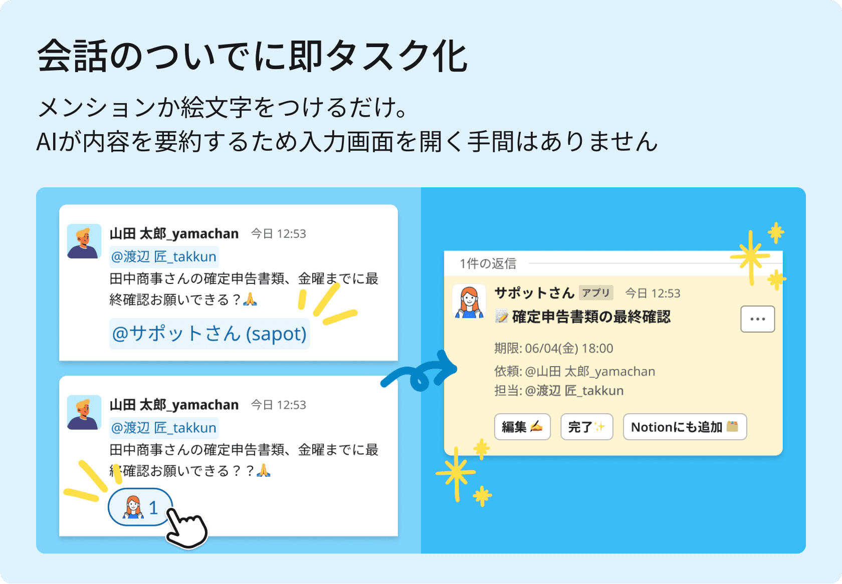 サポットさんは、Slackの絵文字リアクションかメンションだけで、文脈を読み取ってタスクを作成してくれるアプリです。