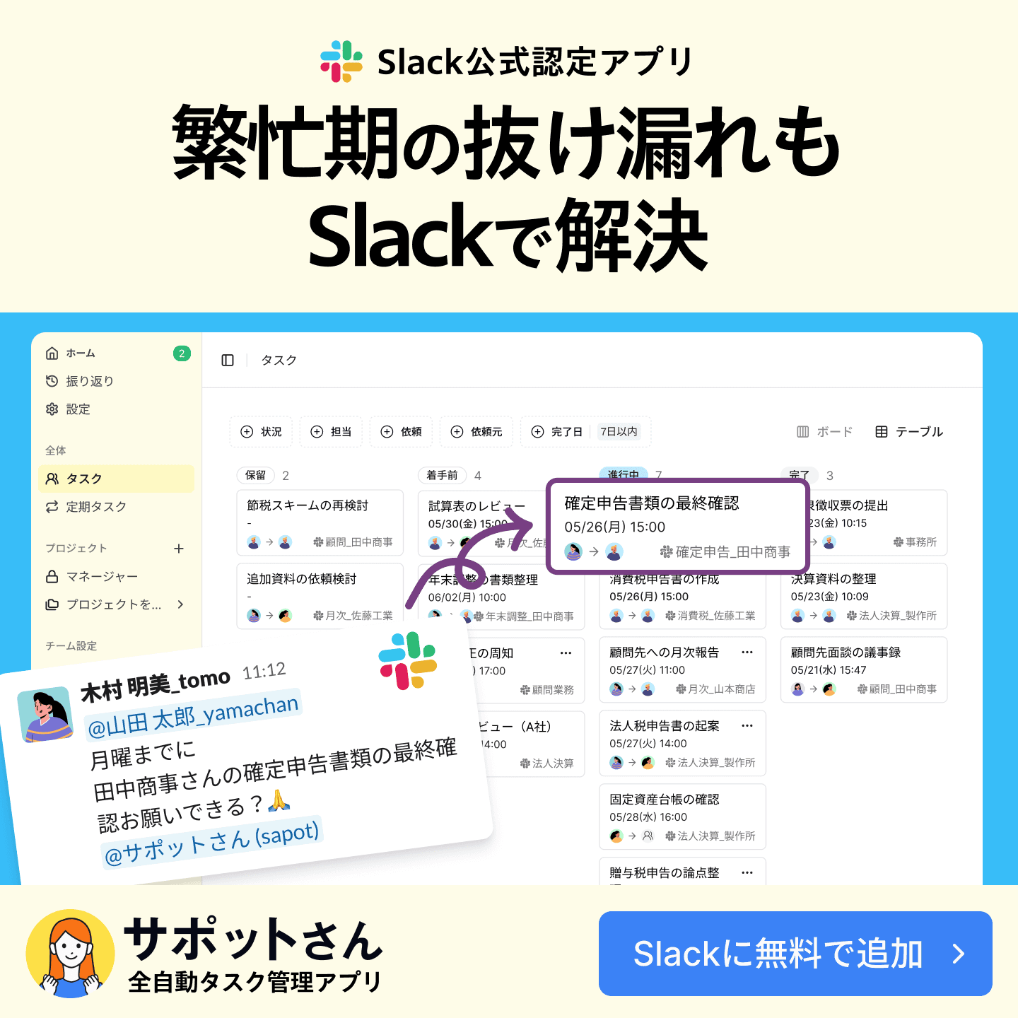 全自動タスク管理アプリの「サポットさん」は、すでに使っているSlackを活用して、タスク管理を自動化できます。