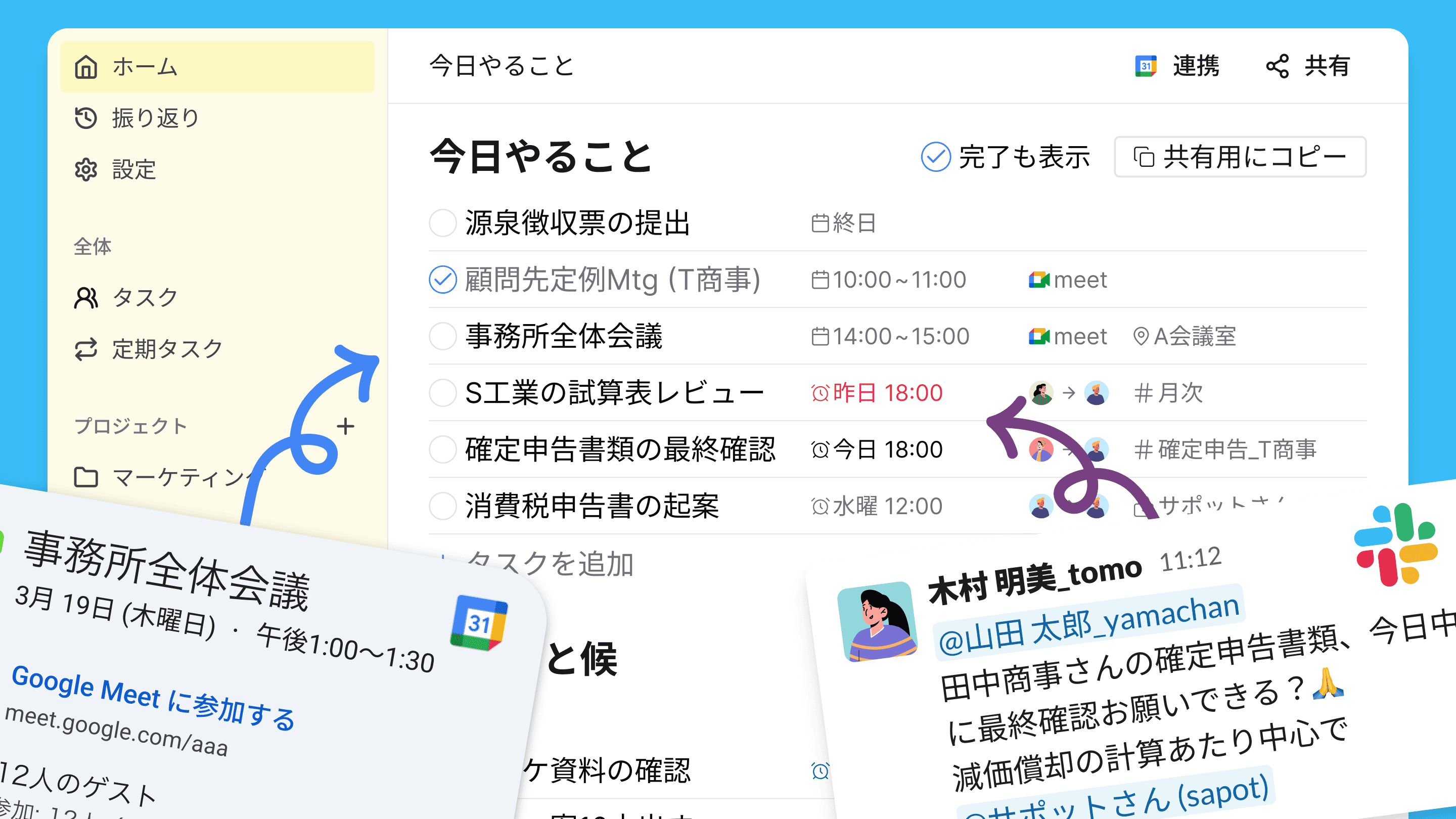 タスク確認とスケジュール確認を一画面でできれば、SlackやGoogleカレンダーを往復する必要はありません。